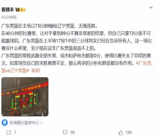 这样的结果无疑让广东球迷非常不满,第四节比赛还没打完,现场就已经有不少广东球迷选择提前离场,输球不可怕,可怕的是输得不明不白,让人看不到希望。那么问题也来了,一番战大胜辽宁30分的广东队,为何却在人员齐整的二番战里吃下了一场主场73-89的16分惨败呢?不妨来看看赛后各路篮球媒体人的看法。